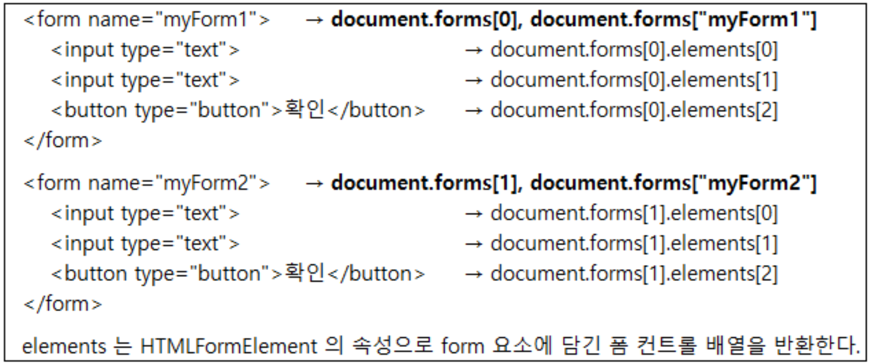 | elemennts | FORM ์์์ ๋ด๊ธด ๋ชจ๋ form ์ปจํธ๋กค(control) ๋ฐฐ์ด์ ๋ฐํํ๋ค. |