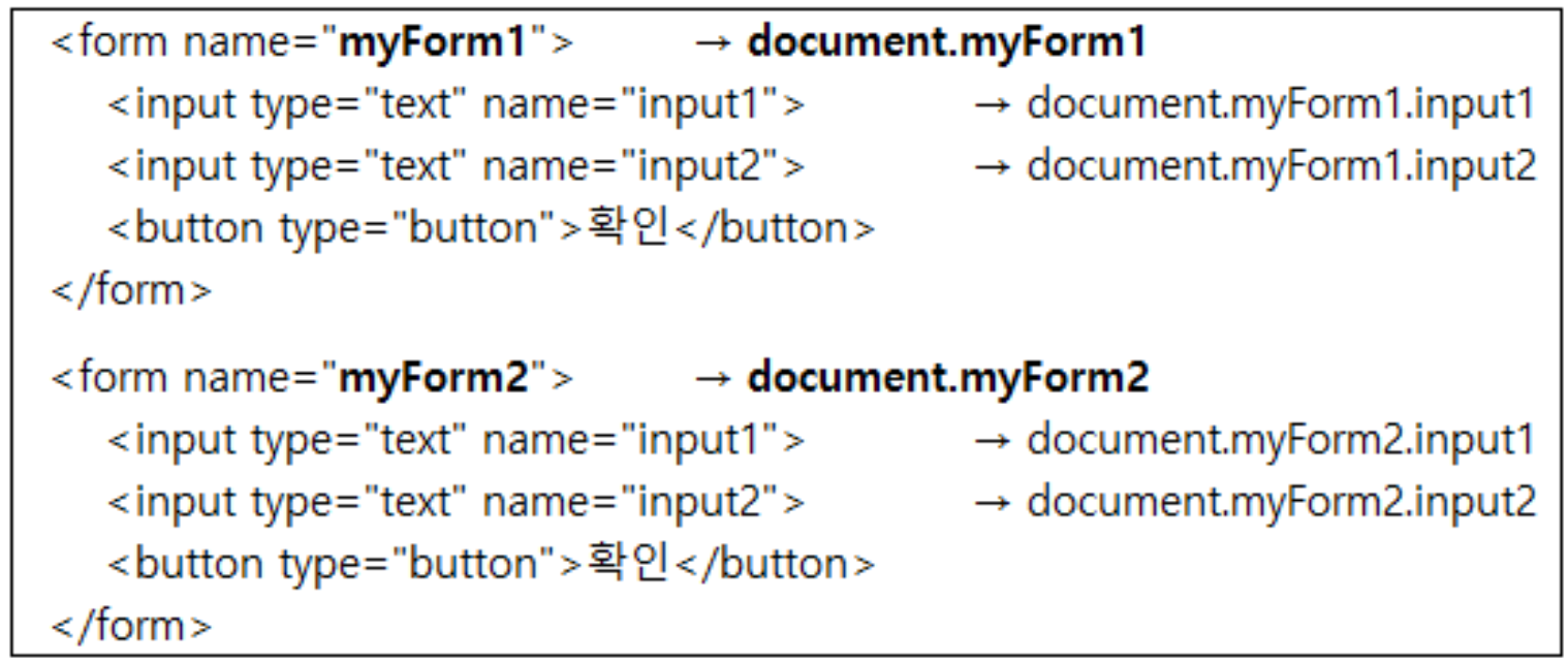 <form>์ด๋ผ๊ณ ํ๋ ๊ฒ์ ์ ์ฌ ๋ฐฐ์ด์ด๋ผ๊ณ ์๊ฐํ๋ฉด ํธํ๋ค.