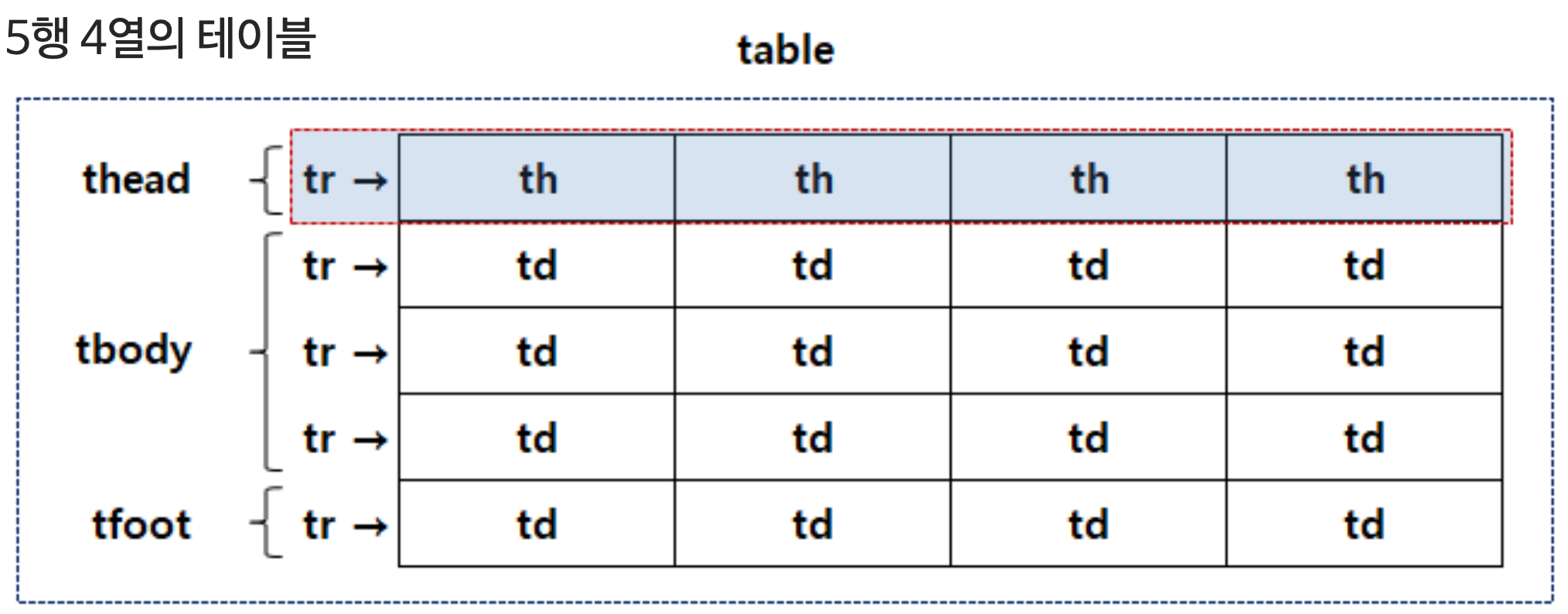 <table> νκ·Έλ <caption>, <col>, <colgroup>, <thead>, <tfoot>, <tbody> νκ·Έλ₯Ό ν¬ν¨ ν μ μλ€.